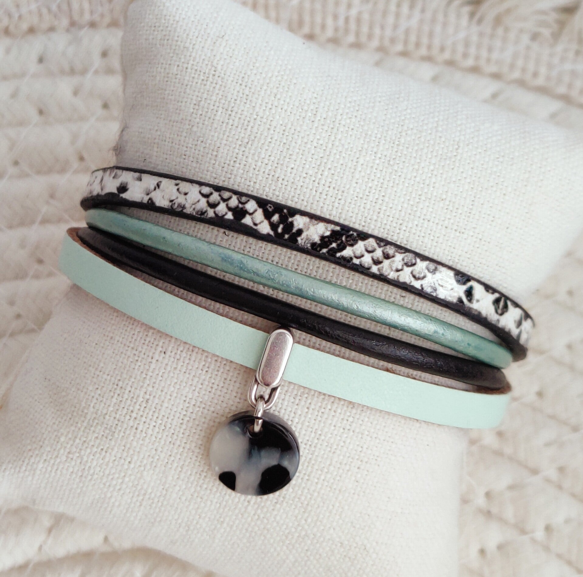 Zomerse armband bestaande uit een mix van fijne, ronde en platte leren bandjes.