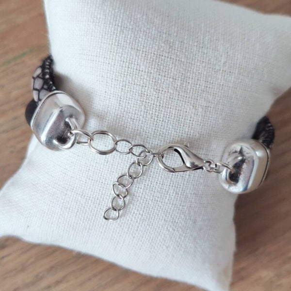 De armband gaat eenmaal om de pols en heeft een karabijnslot met verlengkettinkje, waardoor hij in lengte verstelbaar is.