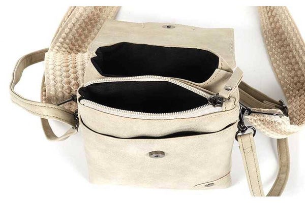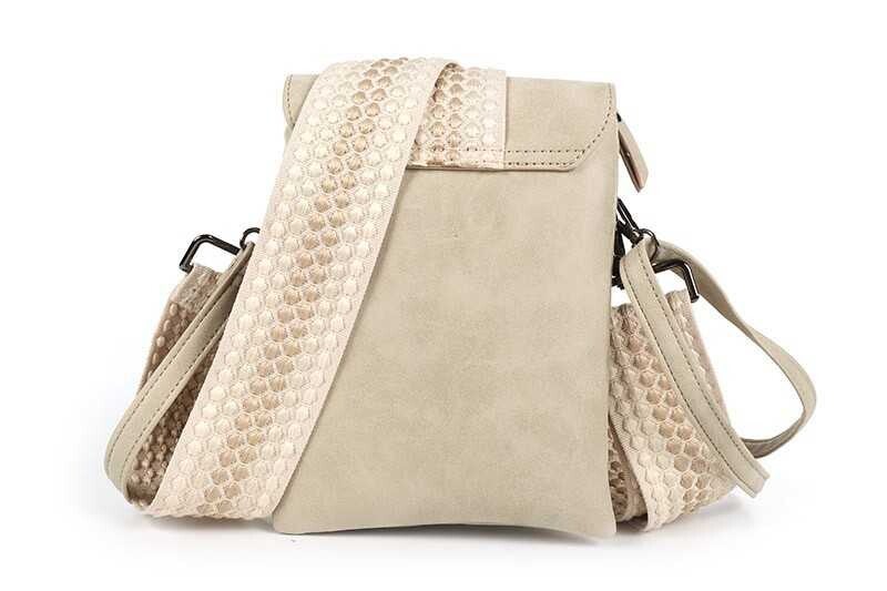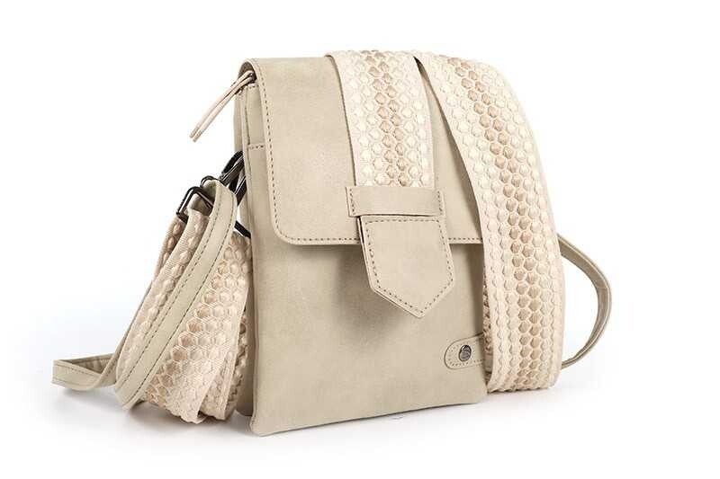 Je kunt het effen basisbandje gebruiken in dezelfde kleur als het tasje of de brede geweven schouderband in dezelfde print als verwerkt is op de flap.