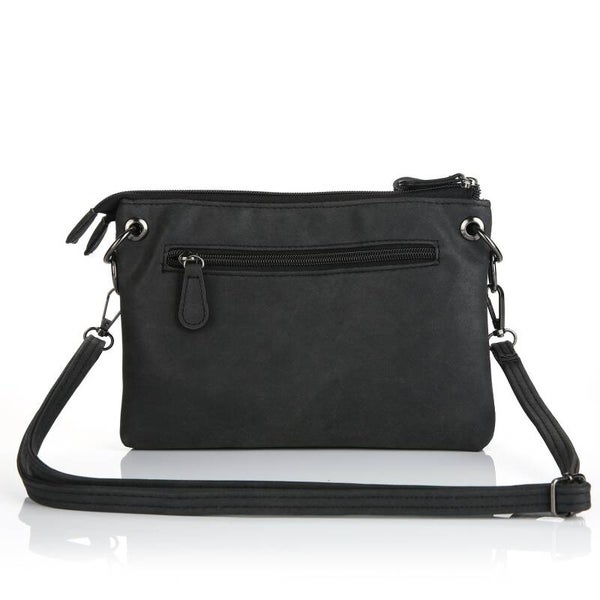 Dit tasje heeft twee royale hoofvakken die afzonderlijk worden afgesloten met een rits.
