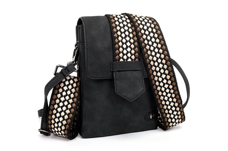 Je kunt het effen basisbandje gebruiken in dezelfde kleur als het tasje of de brede geweven schouderband in dezelfde print als verwerkt is op de flap.