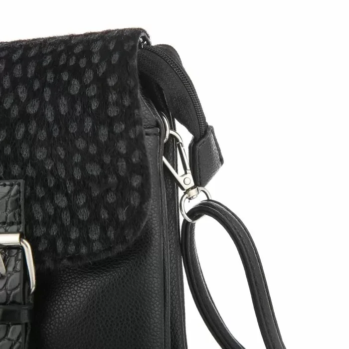 Het tasje heeft een mooie flap met cosiergesp en dierenprintvachtje welke wordt afgesloten met een magneetslotje.
