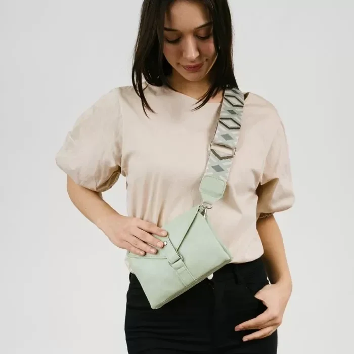 De bagstrap (geweven schouderband) is verwisselbaar door middel van de karabijnhaak en kan in lengte versteld worden.