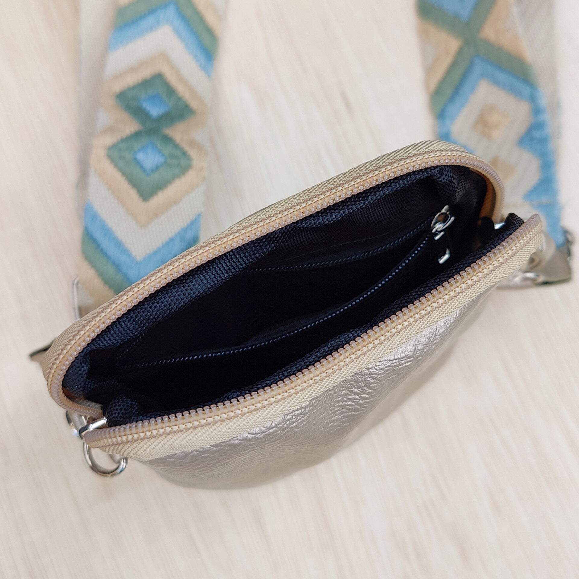 Het tasje wordt geleverd met een trendy geweven schouderband in bijpassende kleuren.