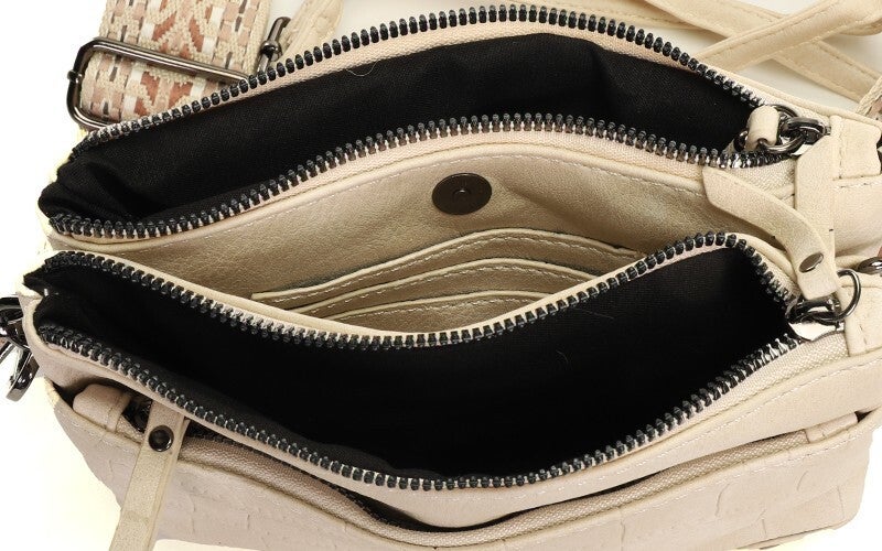 Aan de voorkant van het tasje bevindt zich nog een royaal vak met ritssluiting, afgewerkt met een luxe croco print – perfect voor je telefoon of andere belangrijke items.