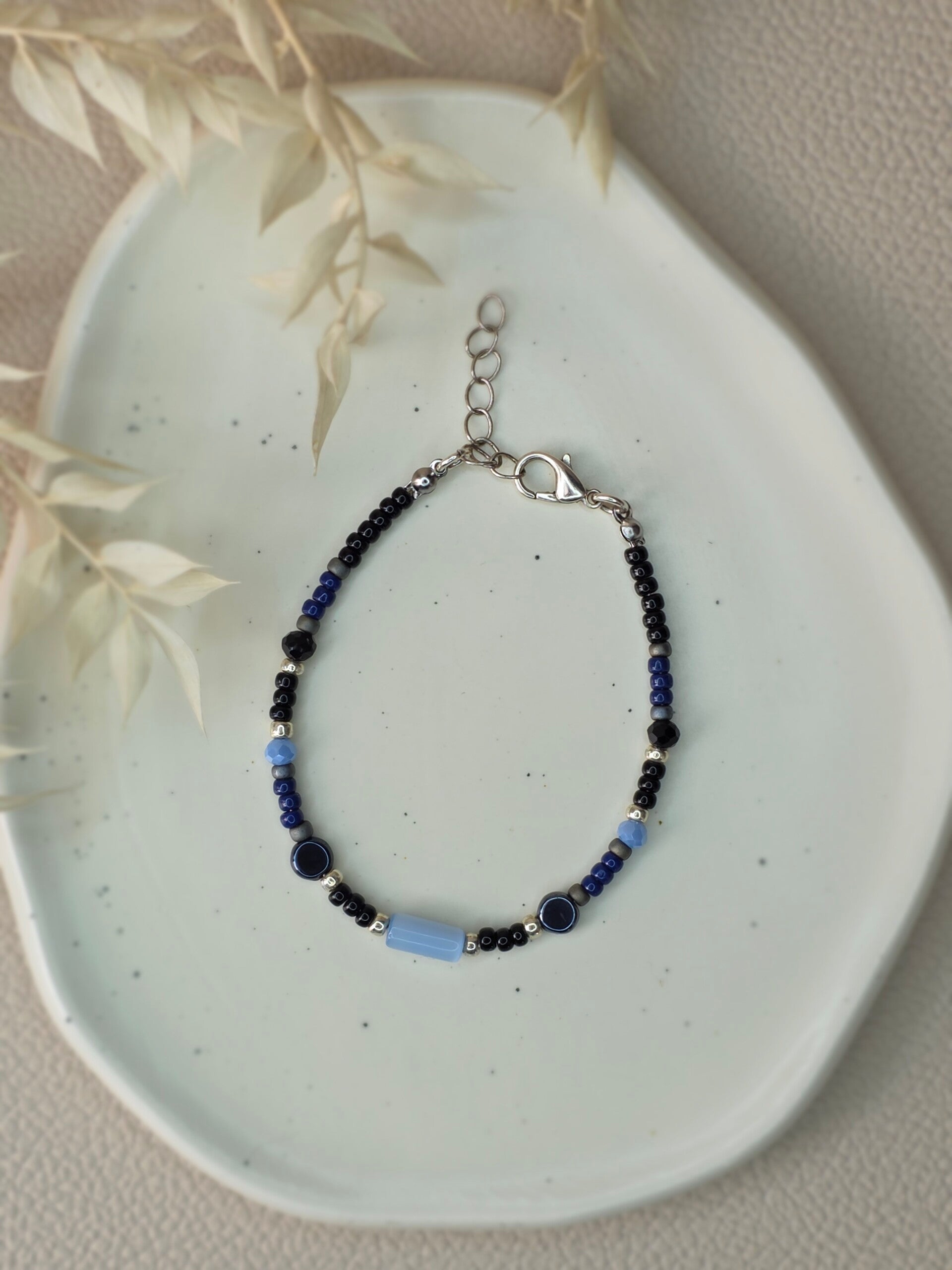 Het armbandje is geregen op gecoat staaldraad en afgewerkt met een karabijnslot en verlengkettinkje waarmee je hem gemakkelijk in lengte kunt verstellen.