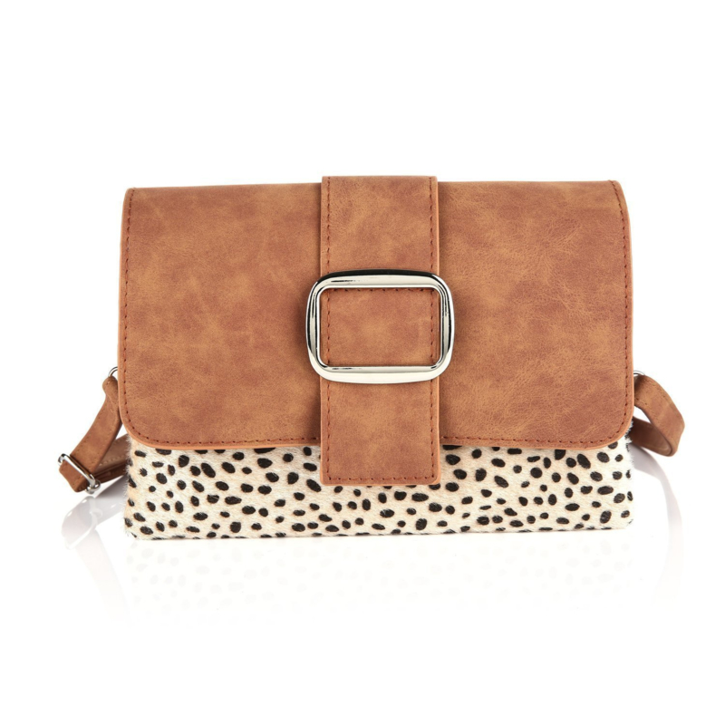 De gehele voorzijde (ook onder de flap) is voorzien van een trendy cheetahvachtje.