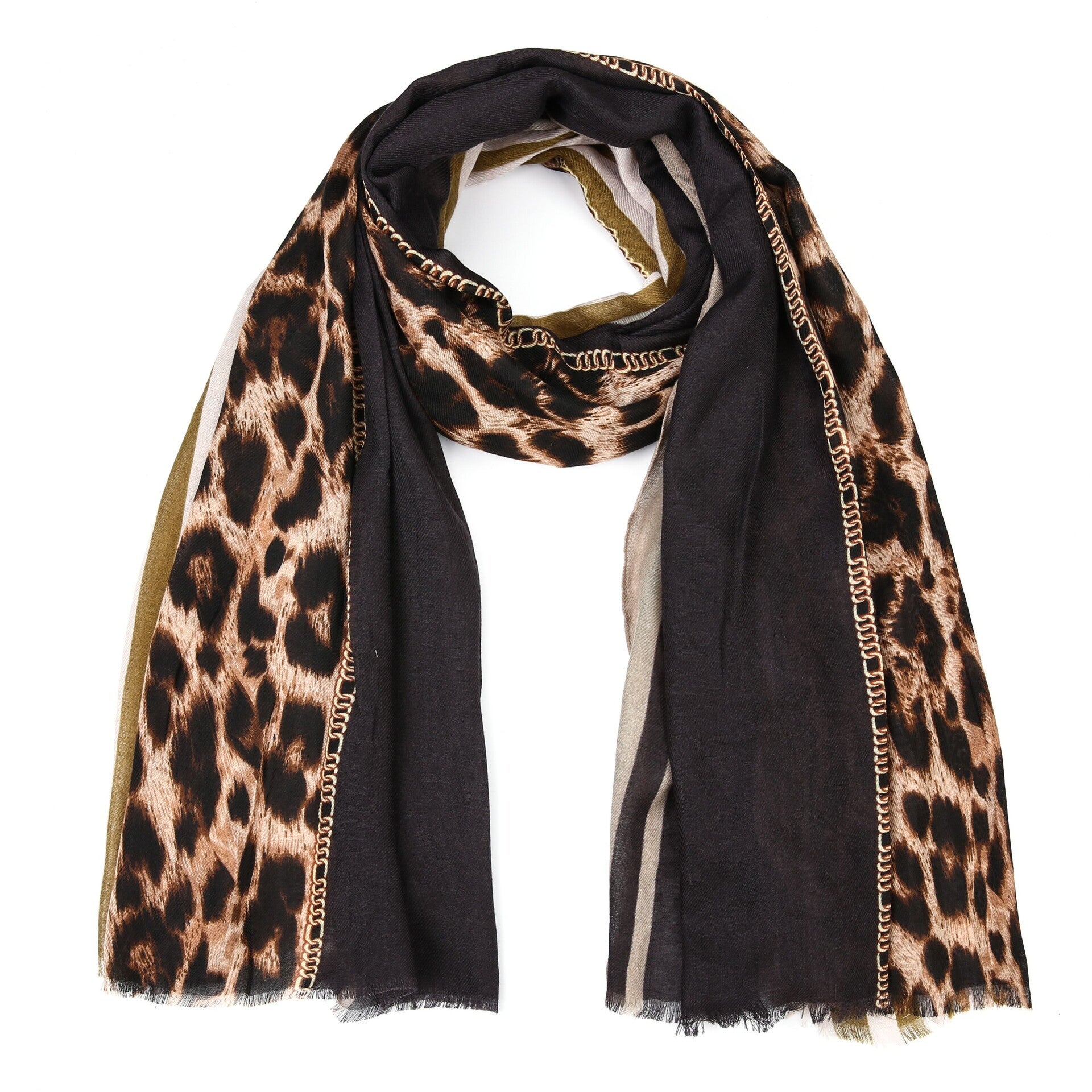 Modieuze damessjaal uitgevoerd in een mix van patronen en kleuren.