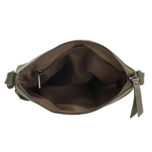 ArtaKleur: olijfgroenMateriaal: binnenkant polyester / buitenkant PU-leerAfmeting: 24cm (h) x 23,5cm (b)Extra informatie: de schouderband is in lengte verstelbaar