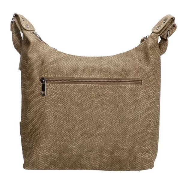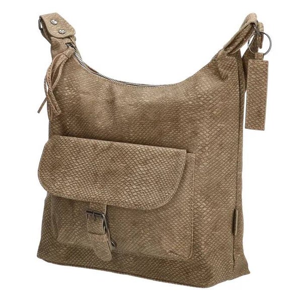 CamarinasKleur: donkertaupeMateriaal: binnenkant polyester / buitenkant PU-leerAfmeting: 27cm (h) x 28cm (b)Extra informatie: de schouderband is in lengte verstelbaar